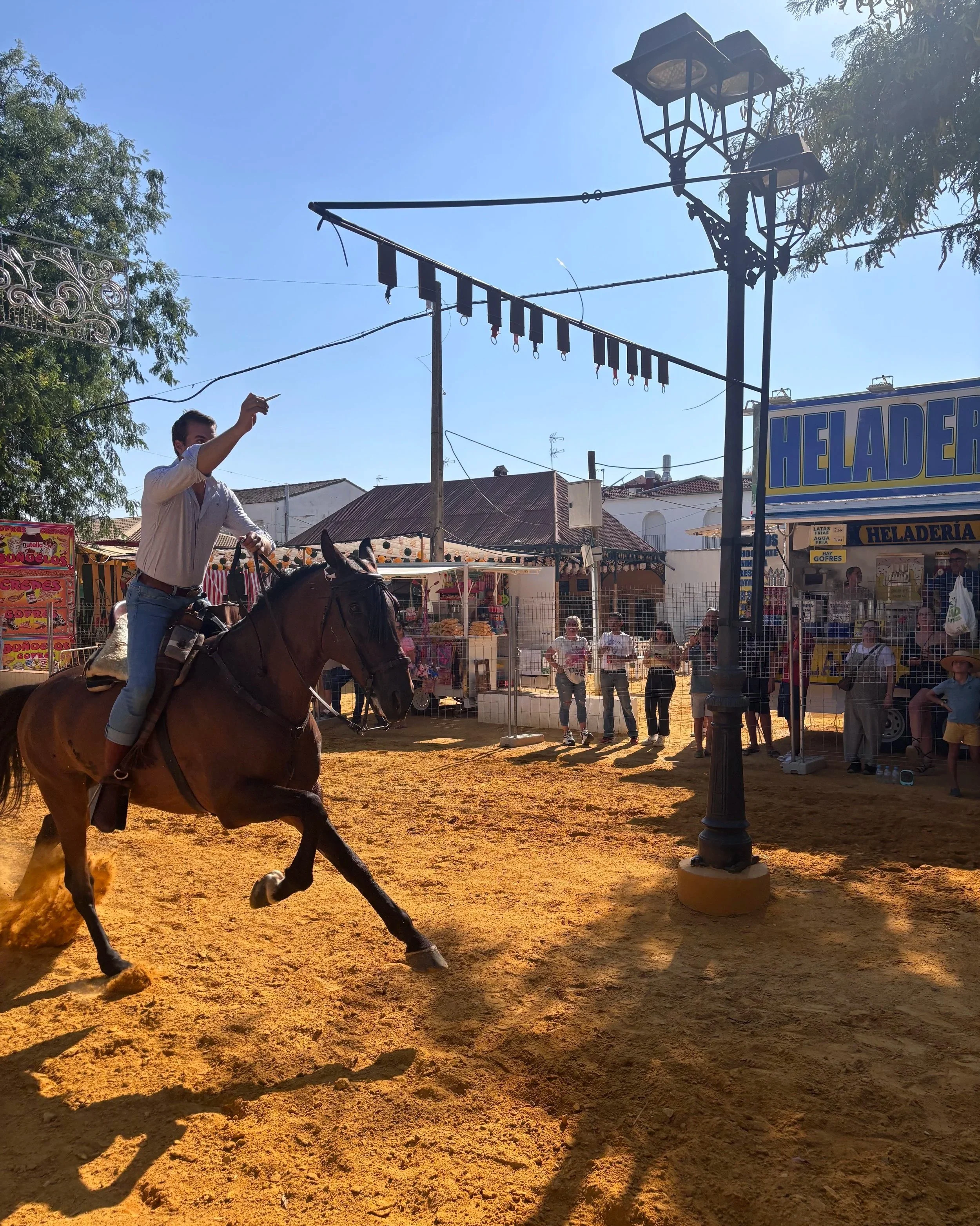 The month of August in Cazalla de la Sierra is a never ending series of Fiestas and Ferias showcasing the local culture. Our favourite of the summer is the Carrera de Cintas or a ribbon race on horseback. The main square is layered with a fresh coat of Albero (the yellow earth which gives that iconic brightness to the bullrings of Spain) in preparation for the revival of a medieval tournament where the ‘knights’, in this case any villager with a horse, showcase their valour and athleticism, galloping with a spear or hook towards a set of hoops on ribbons to a chorus of booing, heckling and cheering from the crowds.